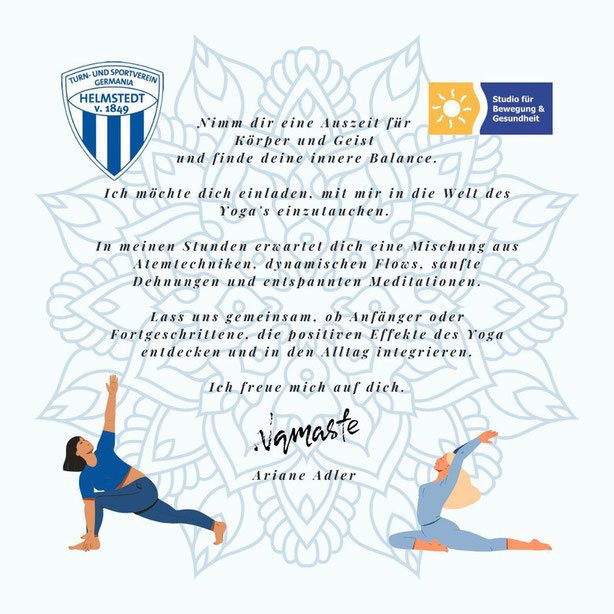 Seit dem 14.01.2025 bietet der TSVG Helmstedt einen Yoga-Kurs mit der zertifizierten Yogalehrerin Ariane Adler in unseren Räumlichkeiten am Holzberg 15/16, 38350 Helmstedt an!